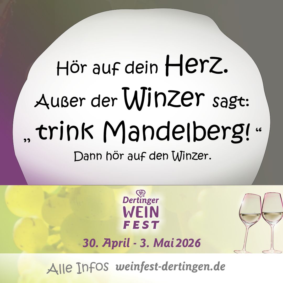 Liebe Weinfreunde, Nach einem Begrüßungssecco zu stimmungsvoller Musik der Schoppendales lädt die Weinfest GbR zu sieben ausgewählten Weinen der Gebietswinzergenossenschaft Franken sowie den Dertinger Selbstvermarktern ein. Dazu gibt es einen Vesperteller mit regionalen Schmankerln. In diesem Jahr besonders: Durch den Abend führt die Dertinger Weinprinzessin Elisa unterstützt durch ehemalige Weinhoheiten des Ortes. Abwechslungsreich begleiten die Damen durch den Abend, stellen die Weine vor und halten dabei einige Überraschungen fürs weinfreudige Publikum bereit – auffallend anders, charmant und authentisch. Dazwischen erklingen immer wieder bekannte Melodien der Schoppendales. Seid dabei bei unserer neu konzipierten großen Festweinprobe, genießt einen kurzweiligen Abend in netter Bekanntschaft bei gutem Wein. Karten gibt es für 32,– Euro per Mail unter weinfest-dertingen@gmx.de. Bitte gebt eine Telefonnummer für die Abwicklung an. Wegen der Umbauten am Festzelt für den neuen Außenbereich, sowie an der Weinbar und den Ständen, wird das Festzelt schon 2 Wochen vor dem Weinfest aufgebaut! Alle Informationen zum Weinfest: wf.derti.de Am 25. April 2026 lädt Dertingen wieder zur großen Fest-Weinprobe in die Mandelberg-Halle ein. Beginn ist um 19:30 Uhr. Die Besucher erwartet eine sorgfältig zusammengestellte 8er-Probe hervorragender Dertinger Weine, begleitet von einem großen Vesperteller. Der Preis für die Teilnahme beträgt 32,- €. Eine besondere Neuerung in diesem Jahr: Ab dann liegen die Autobanner dann auch im Proberaum aus, ich werde welche ins Sportheim und ins Feuerwehrhaus bringen und auch in die Mandelberg-Halle. Ab Ende der Woche werden dann auch die übrigen Werbe-Formate im Proberaum und Sportheim verteilt. Wir freuen uns, wenn ihr alle helft fleißig Werbung fürs Dertinger Weinfest zu machen 😉 Am Samstag, 25. April 2026, lädt Dertingen zur traditionellen Großen Fest-Weinprobe in die Mandelberg‑Halle ein. Besucherinnen und Besucher können sich auf 8 ausgewählte Weinproben aus dem Dertinger Sortiment und einen genussvollen Abend in gemütlicher Atmosphäre freuen. Der Eintrittspreis beträgt 32 €. Der Kartenvorverkauf findet am Wir freuen uns auf zahlreiche Gäste und einen stimmungsvollen Auftakt zum Dertinger Weinfest. Sind Sie noch auf der Suche nach einem passenden Weihnachtsgeschenk? Die Große Weinprobe in Dertingen gilt als beliebter Treffpunkt für alle Weinliebhaber, die einen gute Tropfen und geselliges Beisammensein schätzen. Ob als Geschenk unterm Weihnachtsbaum oder für einen selbst als kleines Highlight im Frühjahr – die Vorfreude auf ein genussreiches, gemeinsames Erlebnis ist garantiert. Jetzt gilt es: Kalender zücken, den 25. April 2026, markieren, Gutschein sichern – und die Vorfreude schon jetzt entkorken. Dertingen freut sich auf Sie! → Gutscheinvorlage als PDF zum selbst Ausdrucken herunterladenFestweinprobe am 25. April 2026 in der Mandelberg-Halle Dertingen