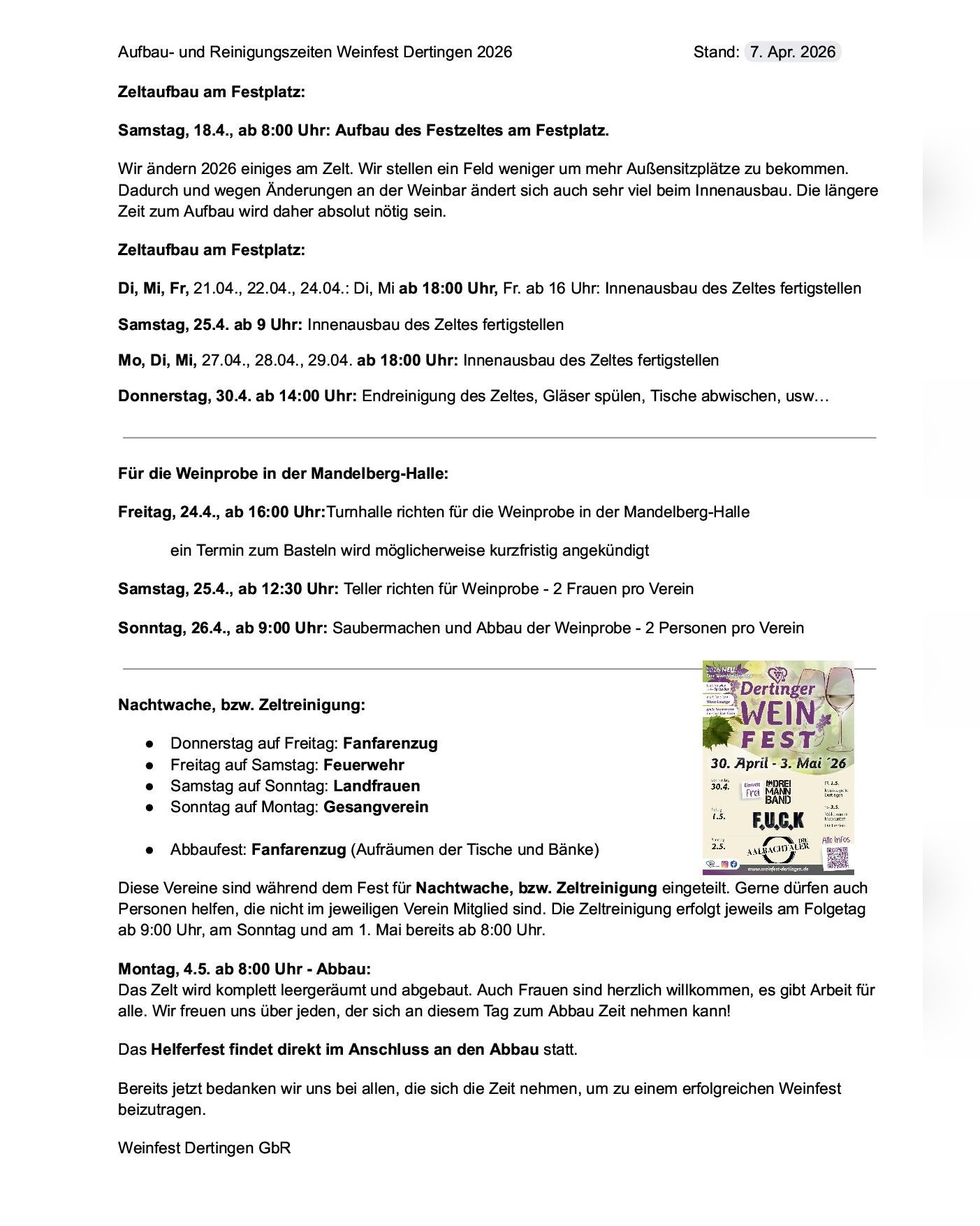 Aufbau- und Reinigungszeiten Weinfest Dertingen 2026 – Zeltaufbau: Sa, 18.4.2026.