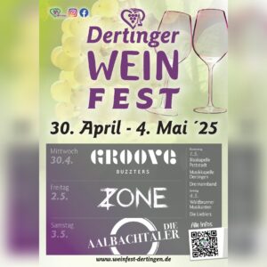 Jugendliche ab 16 bis 18 Jahre haben generell nur bis 24 Uhr Zutritt zum Festzelt. Wer jünger als 16 ist hat nur in Begleitung von Erziehungsberechtigten Zutritt! Eltern, die ihre minderjährigen Kinder (16-18 Jahre) länger auf das Fest lassen wollen können unter Umständen an eine erwachsene Person ihre Aufsichtspflicht übertragen und dem Kind damit gestatten länger auf dem Fest zu bleiben. Es können die gängigen Aufsichtsübertragungszettel („Muttizettel“) genutzt werden. Hier gibts auch einen zum Herunterladen: Die Entscheidung, ob die Aufsichtsübertragung anerkannt wird, liegt im Ermessen der Securities. Folgende Voraussetzungen müssen erfüllt sein: Elisa, die neue Dertinger Weinprinzessin 2025, lädt ganz herzlich ein zum Dertinger Weinfest von Mittwoch, 30.4. bis Sonntag, 4.5. Verbringen Sie unvergessliche Stunden am Fuß des Mandelbergs bei einem guten Glas Dertinger Wein. Details: www.weinfest-dertingen.de/programm Zur großen Weinprobe am 26. April wurde die 37. Dertinger Weinhoheit gekürt Die neue Dertinger Weinprinzessin heißt Elisa Hörner. Traditionell zur großen Weinprobe im Vorfeld des Dertinger Weinfestes wurde sie in der Mandelberghalle am 26. April gekrönt. Elisa ist 20 Jahre alt und studiert derzeit Medienmanagement an der Hochschule in Würzburg. Schon als Kind hat Elisa davon geträumt, einmal die Weinkrone in Dertingen zu tragen „genau wie meine Tante Toni“, erzählt sie. Antonia Schenk geb. Hörner war 17 Jahre zuvor Weinrepräsentantin im Ort. Mit Elisa kehrt die Weinkrone für ein Jahr in die Dertinger Winzerfamilie zurück. Papa Jochen Hörner betreibt bereits in vierter Generation den Weinbau. In ihrer Freizeit tanzt Elisa von Kindesbeinen an im Homburger Carneval-Verein „die Steeaeisel“ e.V. Mittlerweile trainiert sie dort auch den Nachwuchs und singt im Gesangsverein Vocalis Dertingen. Auf die kommende Zeit als Weinhoheit blickt sie mit Begeisterung: „Ich bin gespannt und voller Vorfreude, was mich als Dertinger Weinprinzessin alles erwarten wird.“ Als Prinzessinnenwein hat sich Elisa einen Silvaner Kabinett aus dem Jahr 2023 von der Winzergenossenschaft Tauberfranken ausgesucht. „Ein klassischer Franke“, sagt sie. Obwohl Elisa eher liebliche Weine bevorzuge, habe sie dieser Silvaner mit seiner fruchtigen Note überzeugt. Besucher des Dertinger Weinfestes können diesen klassischen Franke vom 30. April – 4. Mai im großen Festzelt am Fuße des Dertinger Mandelbergs probieren. Am Sonntag, den 4. Mai, wird es parallel dazu zwei Stationen auf dem seit einigen Jahren etablierten Weinwanderweg in Dertingen geben, die zum Verweilen und Schöppeln einladen. Musikalische Highlights am Dertinger Weinfest sind die Groove Buzzters, zu deren Musik in den ersten Mai getanzt wird, die Rocknacht am Freitag, 2.5., mit T-Zone und der zünftige Trachtenabend mit den Aalbachtalern am Samstag, 3.5. Das gesamte Programm zum Dertinger Weinfest finden Sie unter → www.weinfest-dertingen.de/programm. Die Organisatoren des Dertinger Weinfestes wünschen Elisa eine tolle Zeit als Weinhoheit, gute Gespräche und unvergessliche Momente rund um den Dertinger Mandelberg. Gleichzeitig geht für ihre Vorgängerin Katharina Flegler die aufregende Amtszeit zu Ende. Für ihr Engagement bedankt sich der Weinfestausschuss sehr herzlich.1. Mai beim @dertinger_weinfest mit @lissitrinktwein