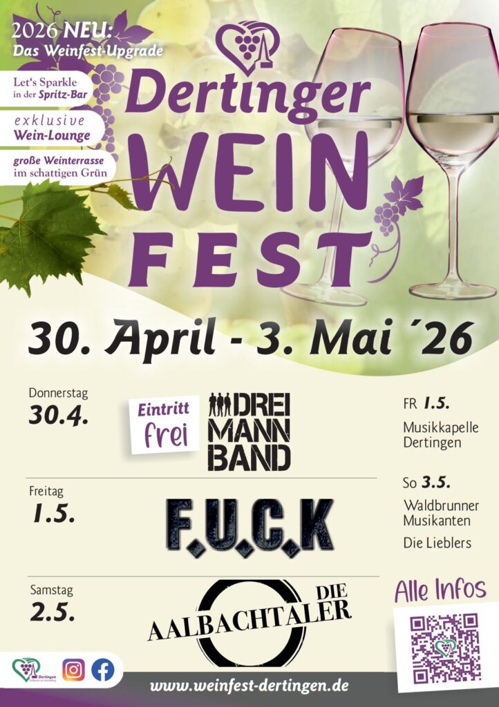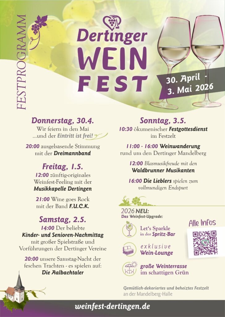 Vom 30. April bis 3. Mai 2026 lädt Dertingen wieder zum traditionellen Dertinger Weinfest ein. Vier Tage lang erwarten die Besucher regionale Weine, gemütliche Atmosphäre und ein abwechslungsreiches Musikprogramm.